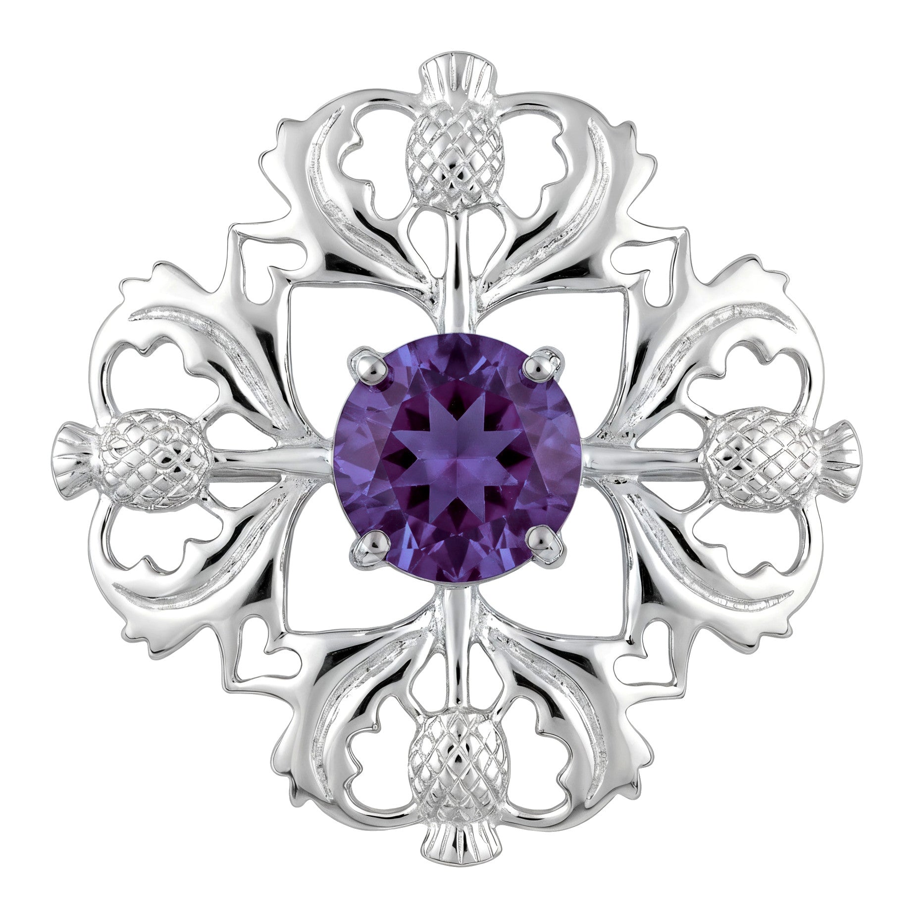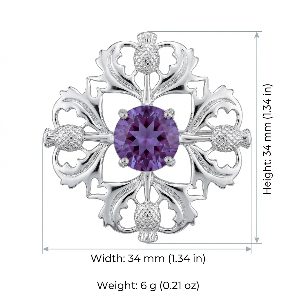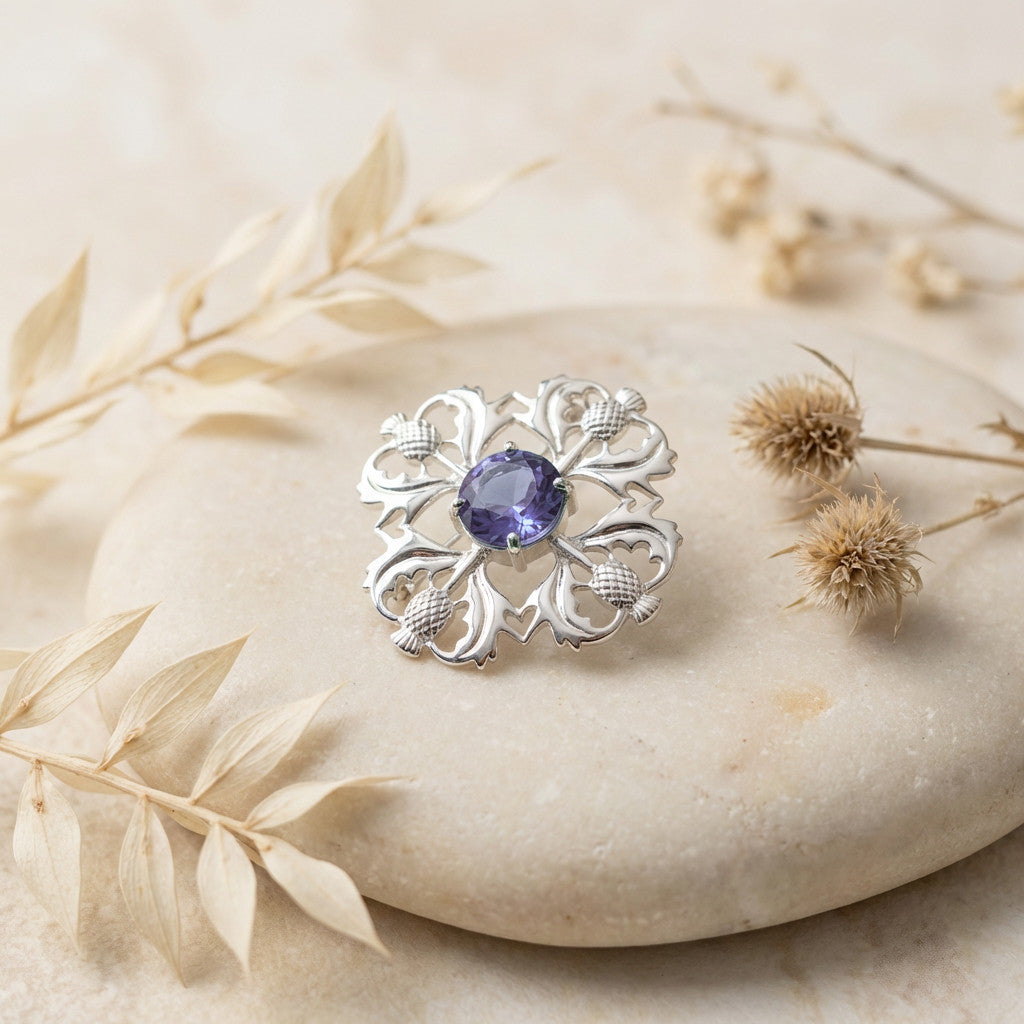 Celebrate Scotland’s heritage with this beautifully detailed sterling silver thistle brooch. Featuring a rich purple centre stone and finely crafted petals, the design symbolises strength, resilience, and pride — a timeless piece that adds character and elegance to any outfit.