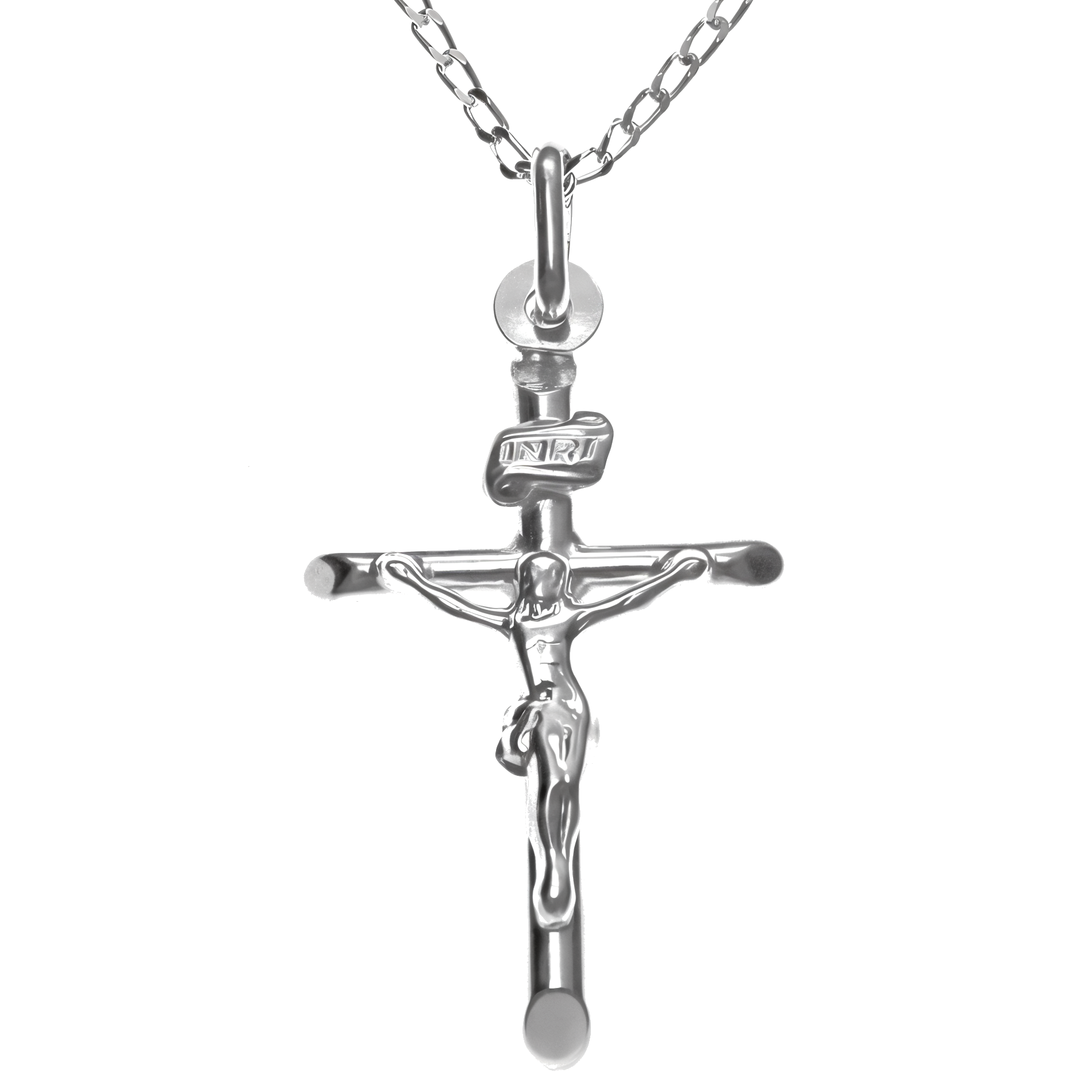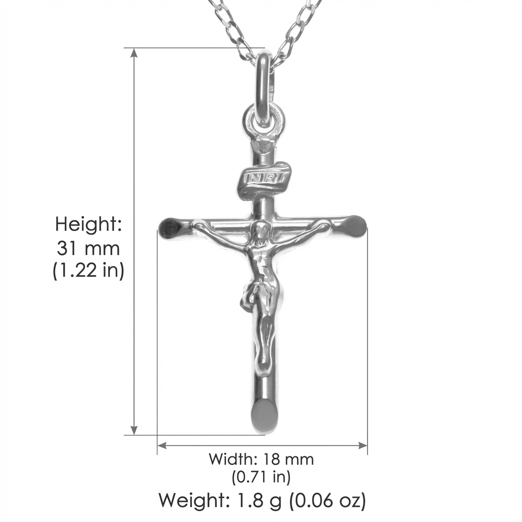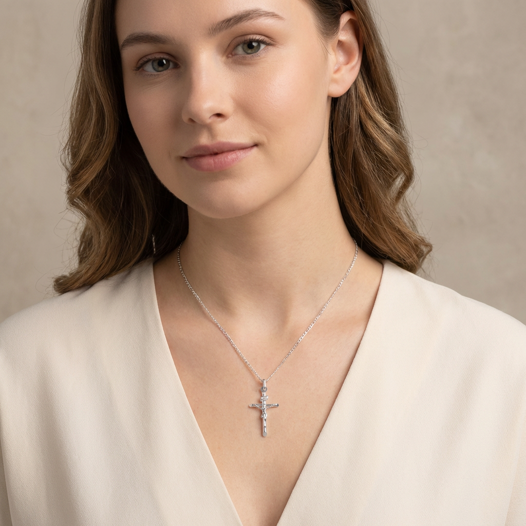 The 31mm x 18mm pendant is perfectly balanced on an 18" sterling silver chain, creating a comfortable and elegant fit designed with women and younger wearers in mind. The silver finish enhances the detailing of the crucifix while remaining understated and versatile.