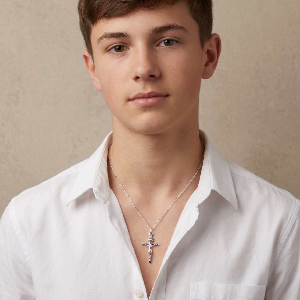 Crafted in solid 925 sterling silver, this classic crucifix necklace features a detailed image of Christ, symbolising faith, sacrifice, and devotion. The clean lines and polished finish give the piece a refined and timeless presence, suitable for everyday wear.