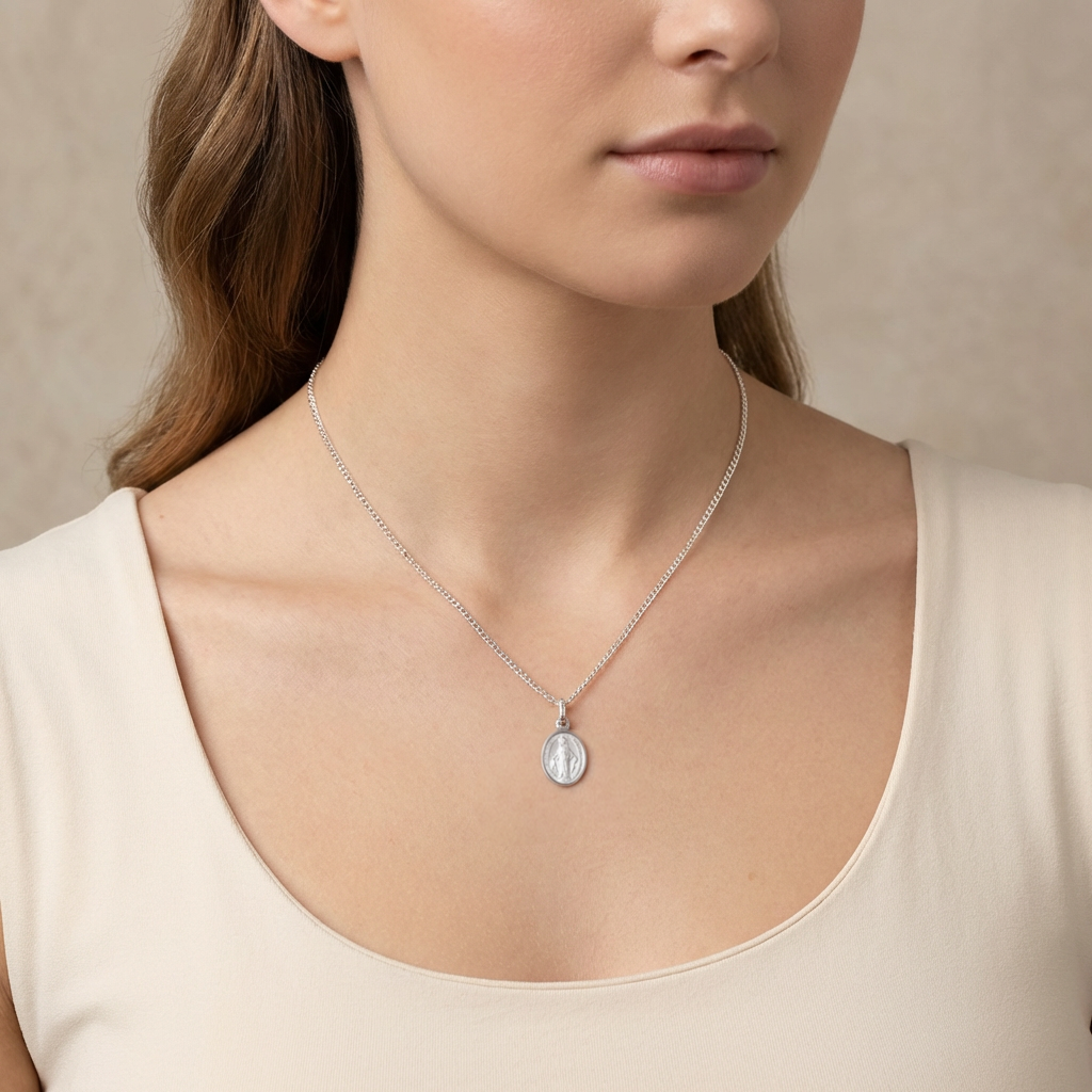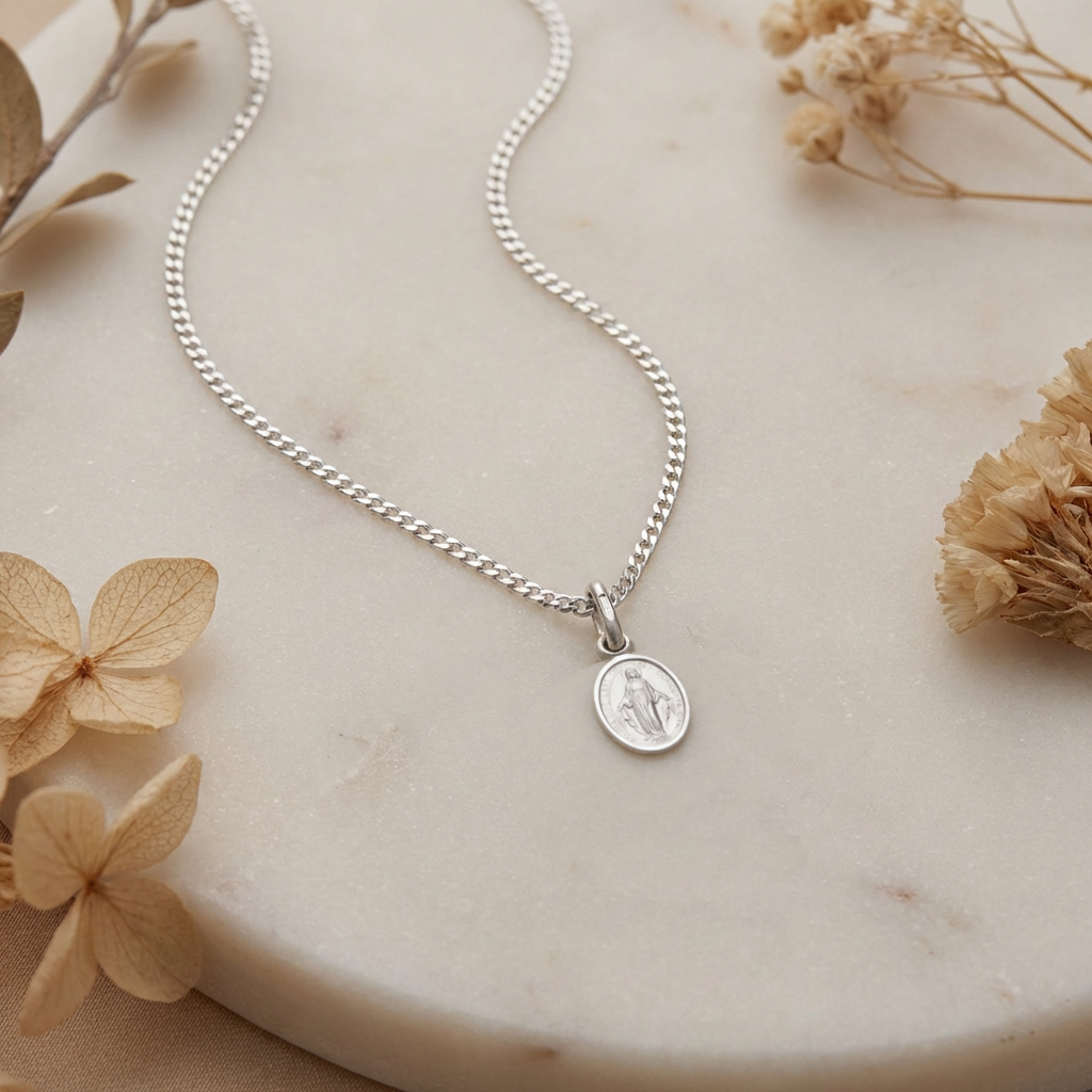 Crafted in solid 925 sterling silver, this small Miraculous Medal necklace is a cherished symbol of faith, protection, and devotion. Featuring the traditional image of the Virgin Mary on the front and the symbolic ‘M’ with stars on the reverse, it reflects the classic design associated with the Catholic Miraculous Medal.