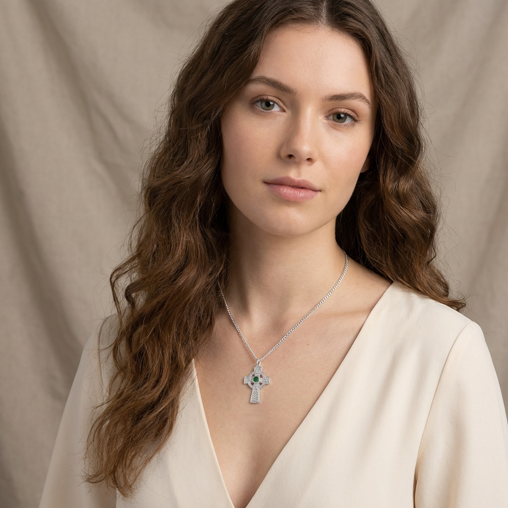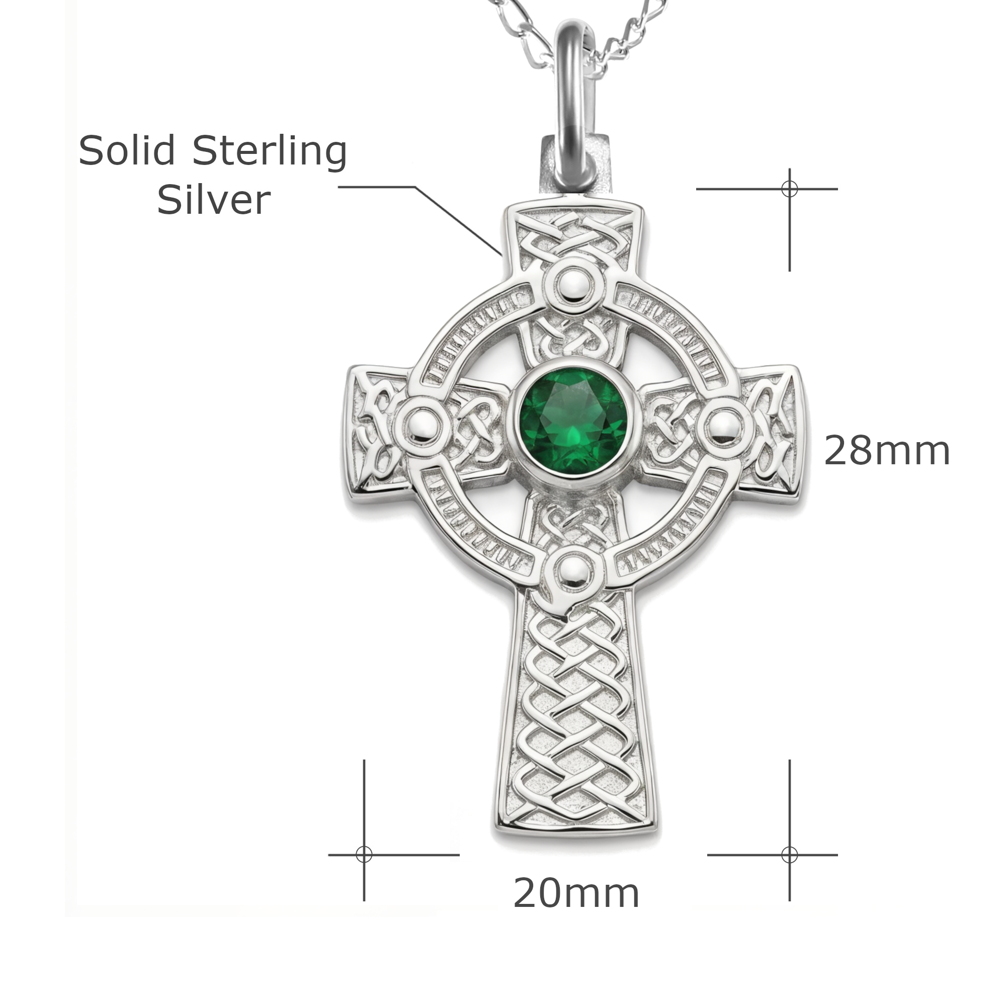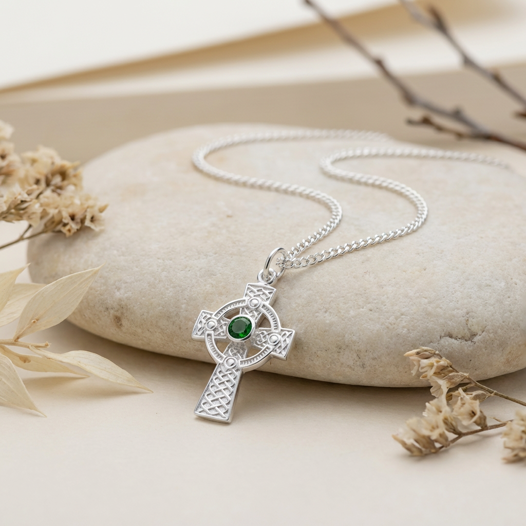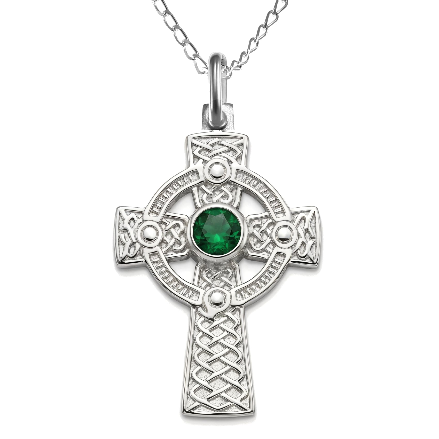 Sterling Silver Celtic Cross Necklace with Green CZ and 18” Chain