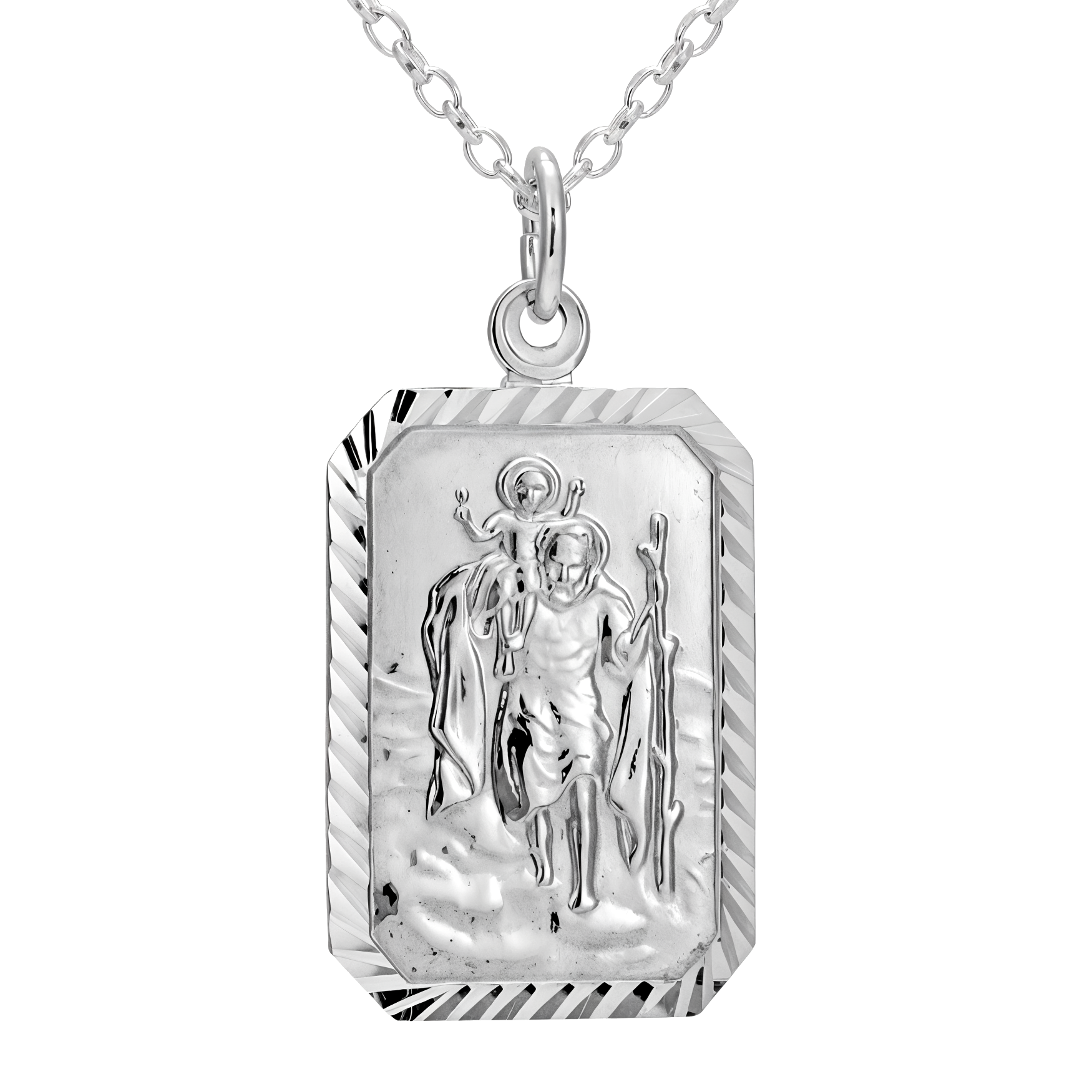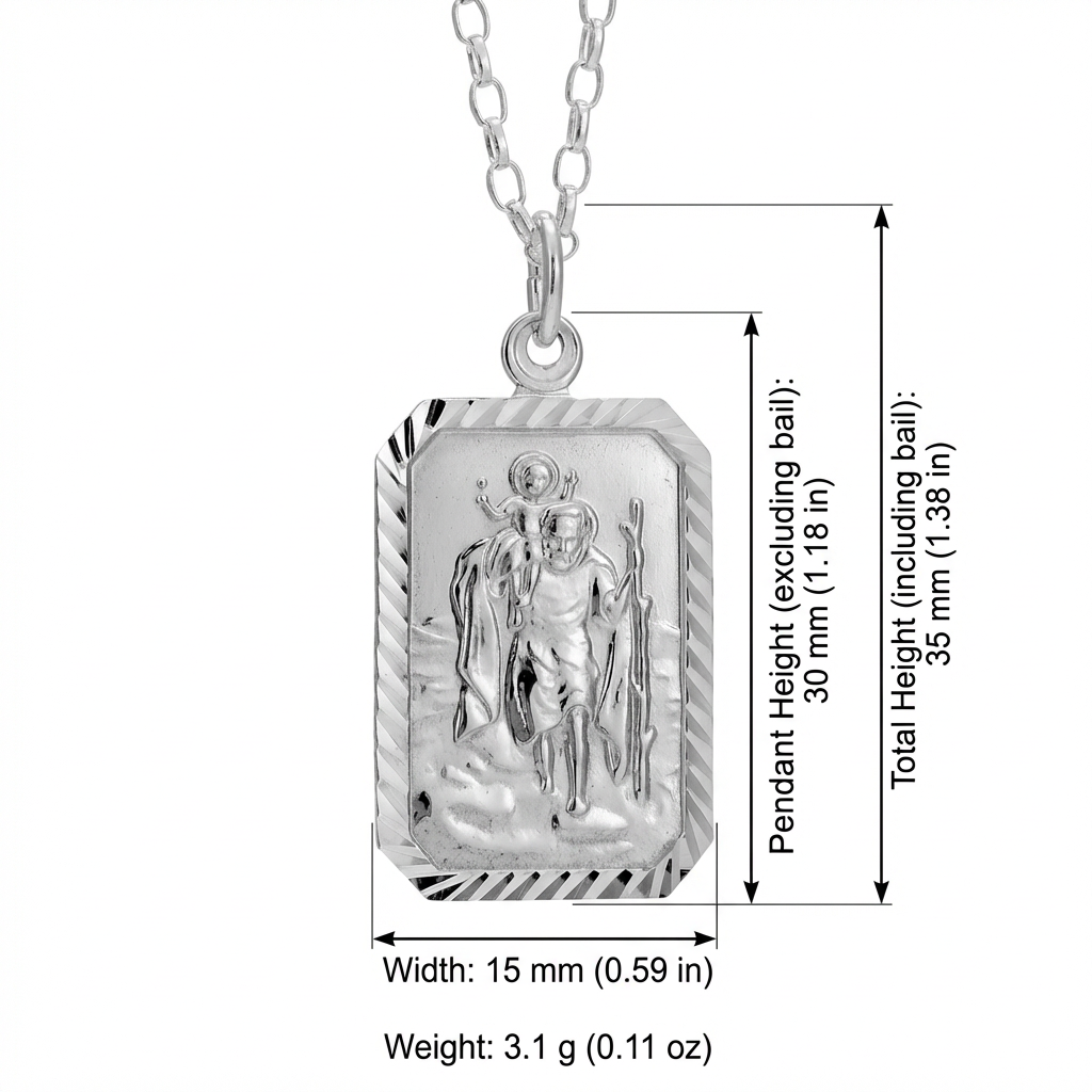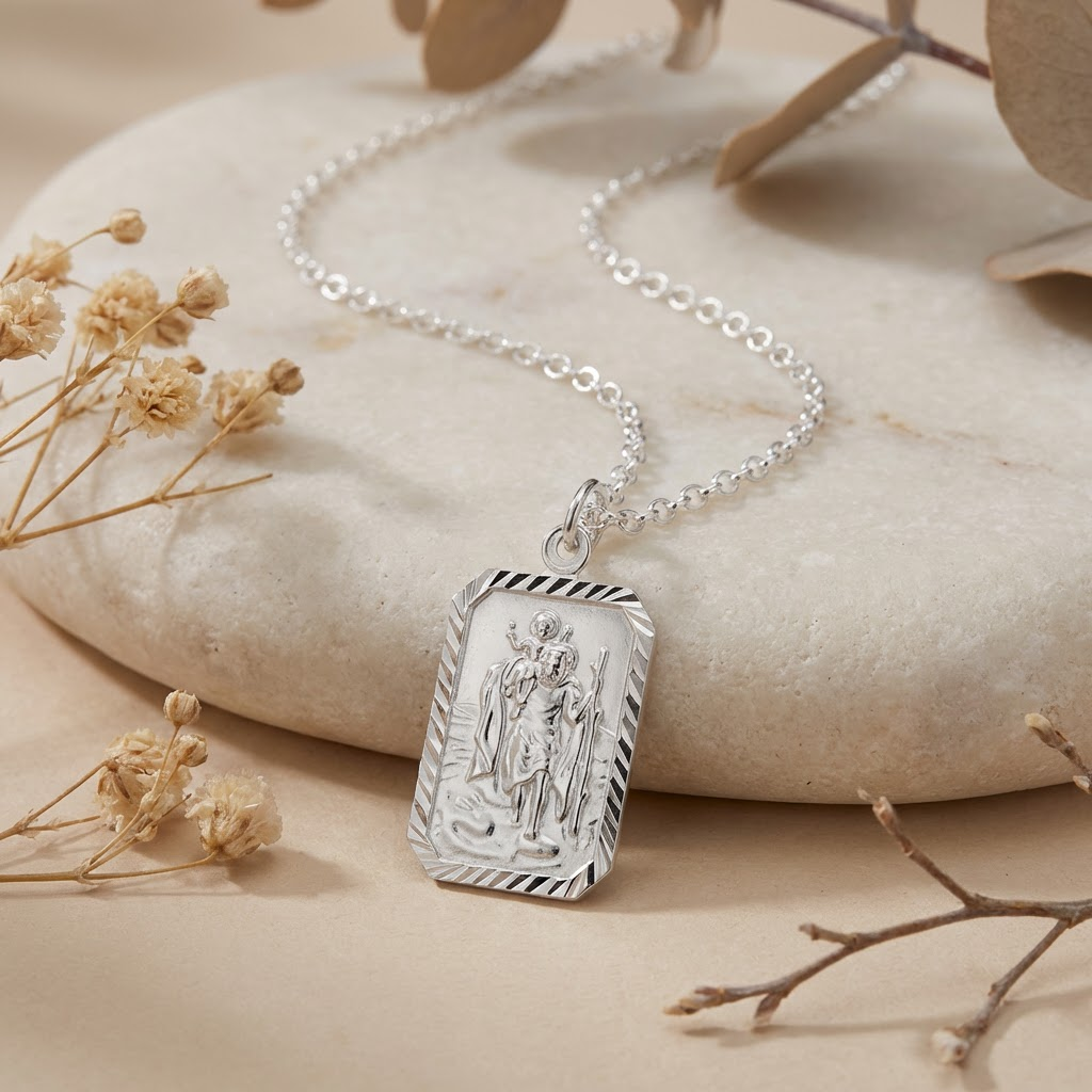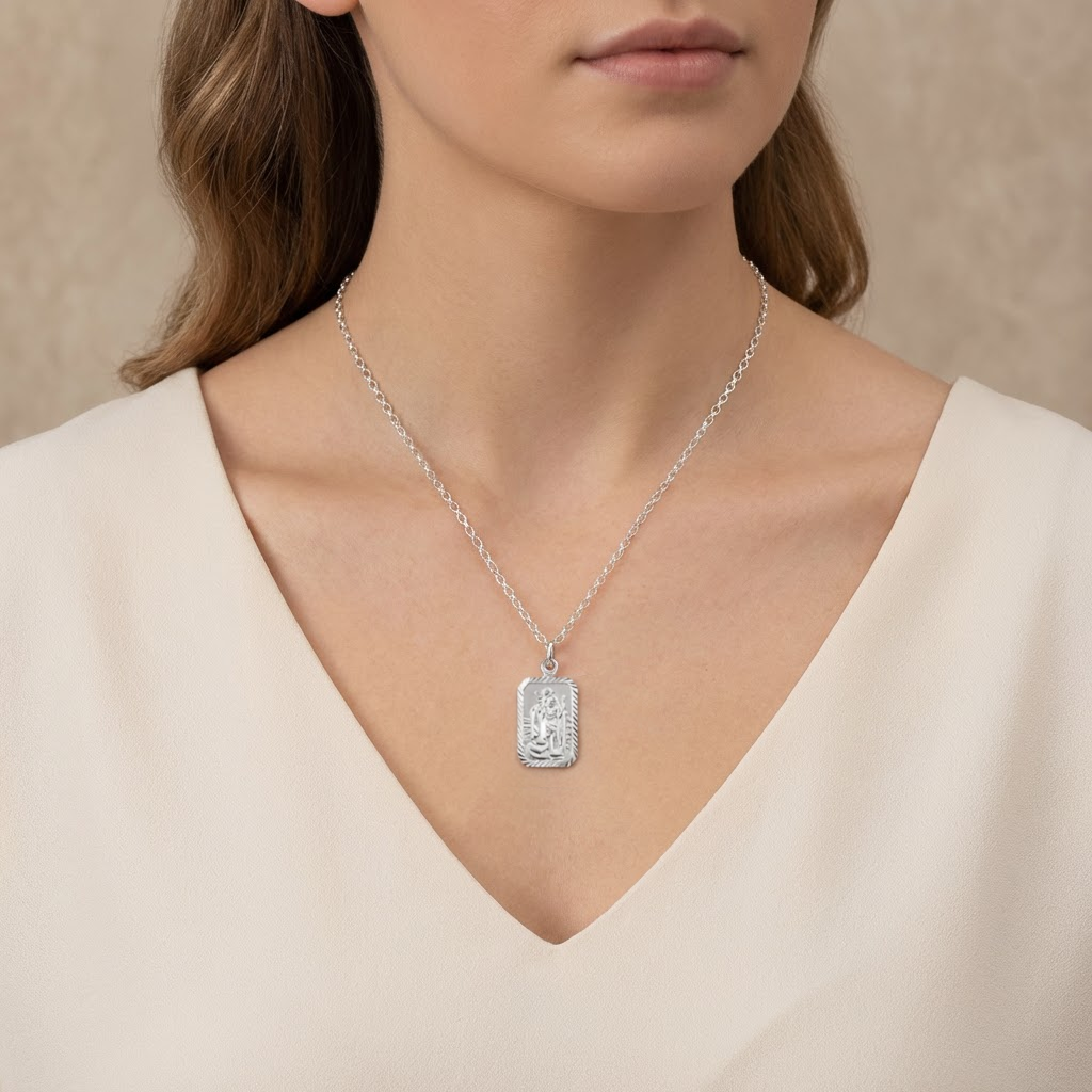 Crafted in solid 925 sterling silver, this rectangular St Christopher necklace is a timeless symbol of protection and safe travels. The clean, modern shape gives a slightly more contemporary look than a traditional round medal, while keeping the classic St Christopher image front and centre.