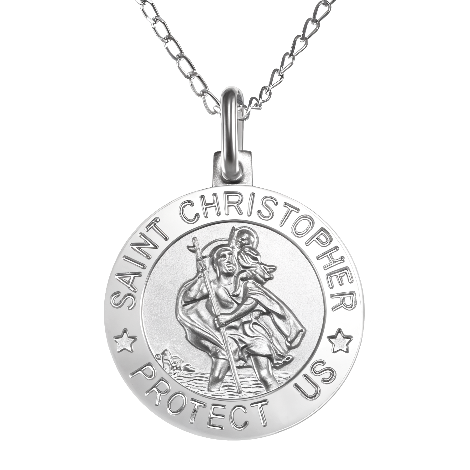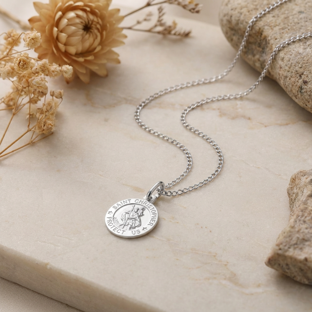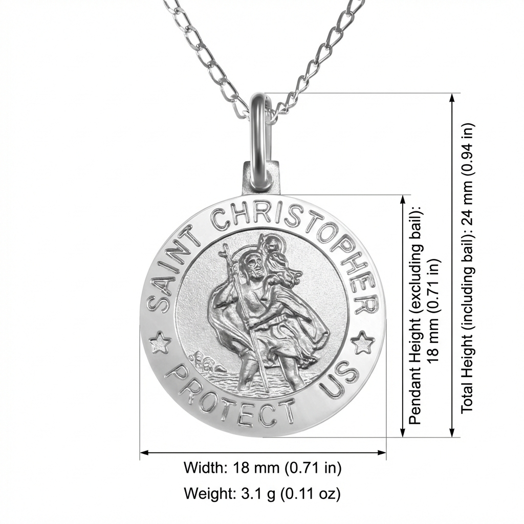 Crafted in solid 925 sterling silver, this 18mm St Christopher pendant carries the traditional inscription “Saint Christopher Protect Us” around the outer edge — a powerful reminder of faith, guidance, and safe journeys.