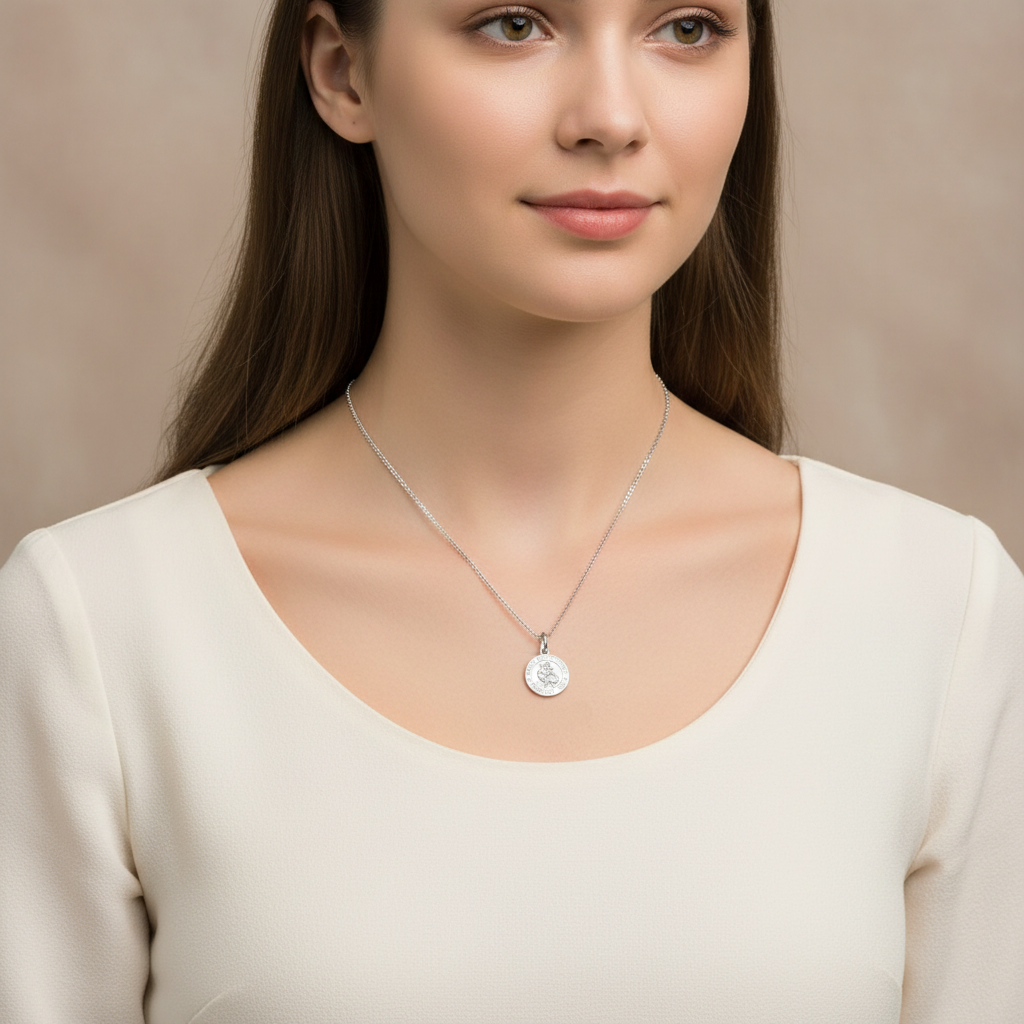 The balanced 18mm size makes it ideal for everyday wear, offering clear detailing without being oversized. The polished plain reverse keeps the design clean and classic, while the inscription adds deeper meaning and reassurance for the wearer.