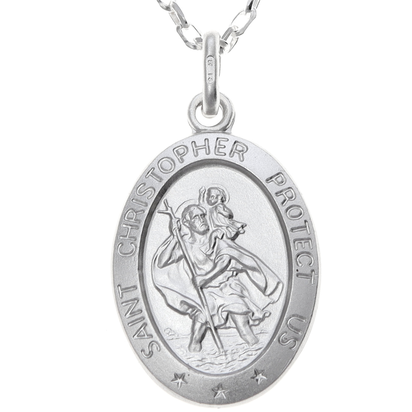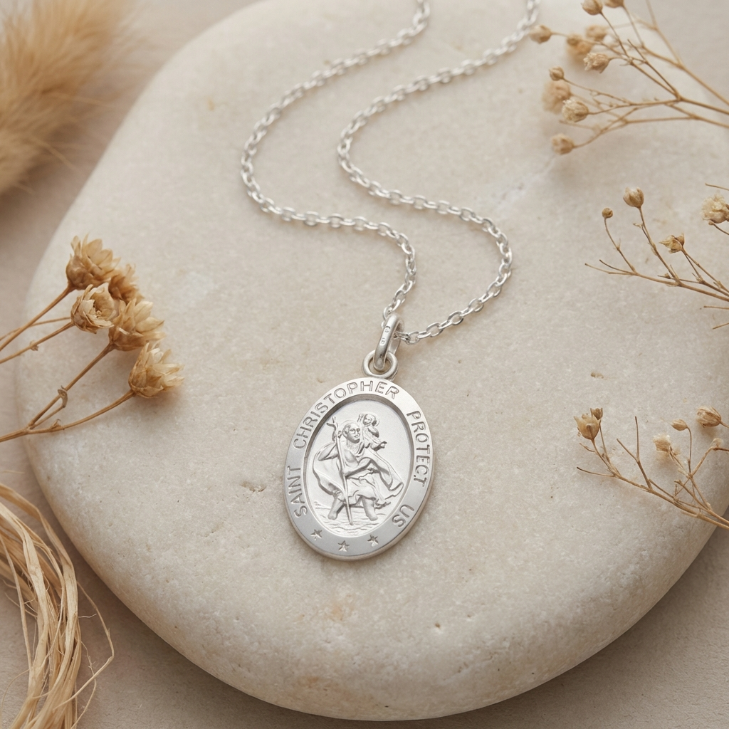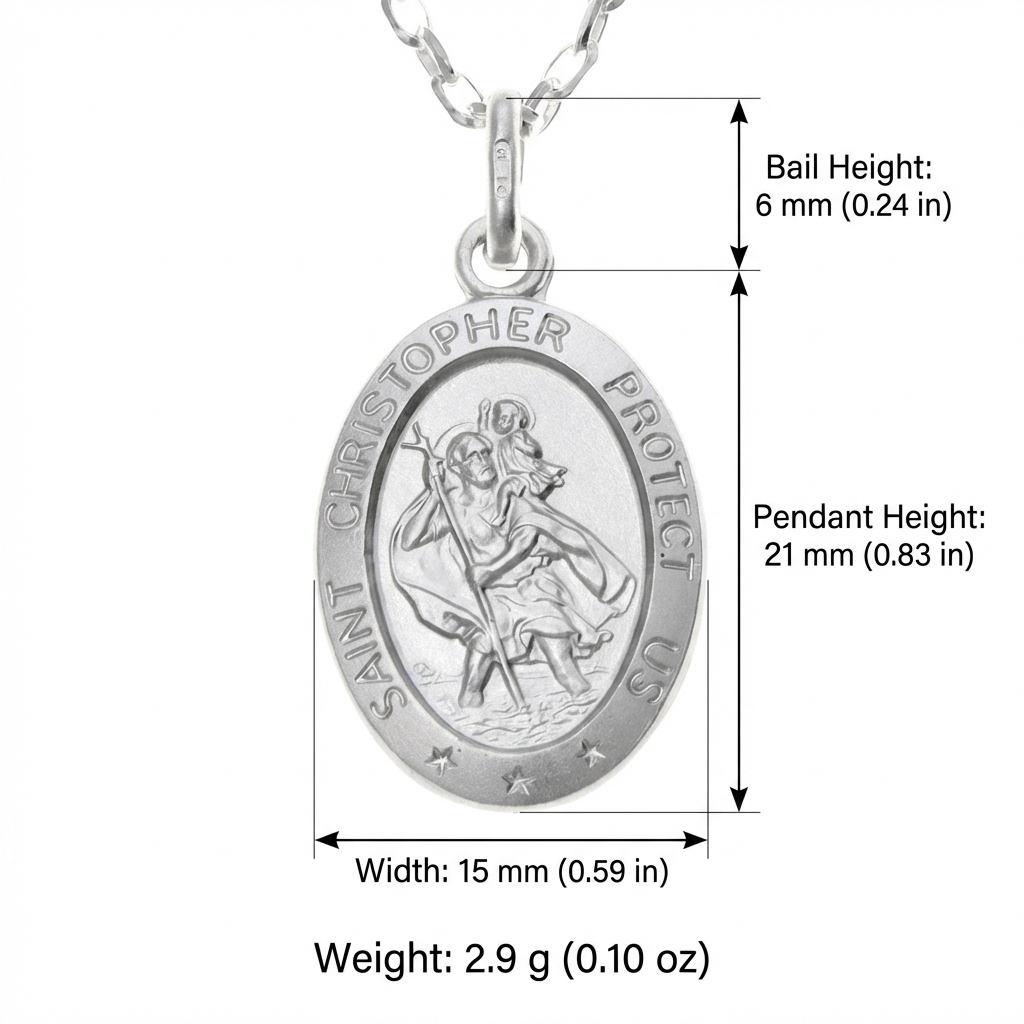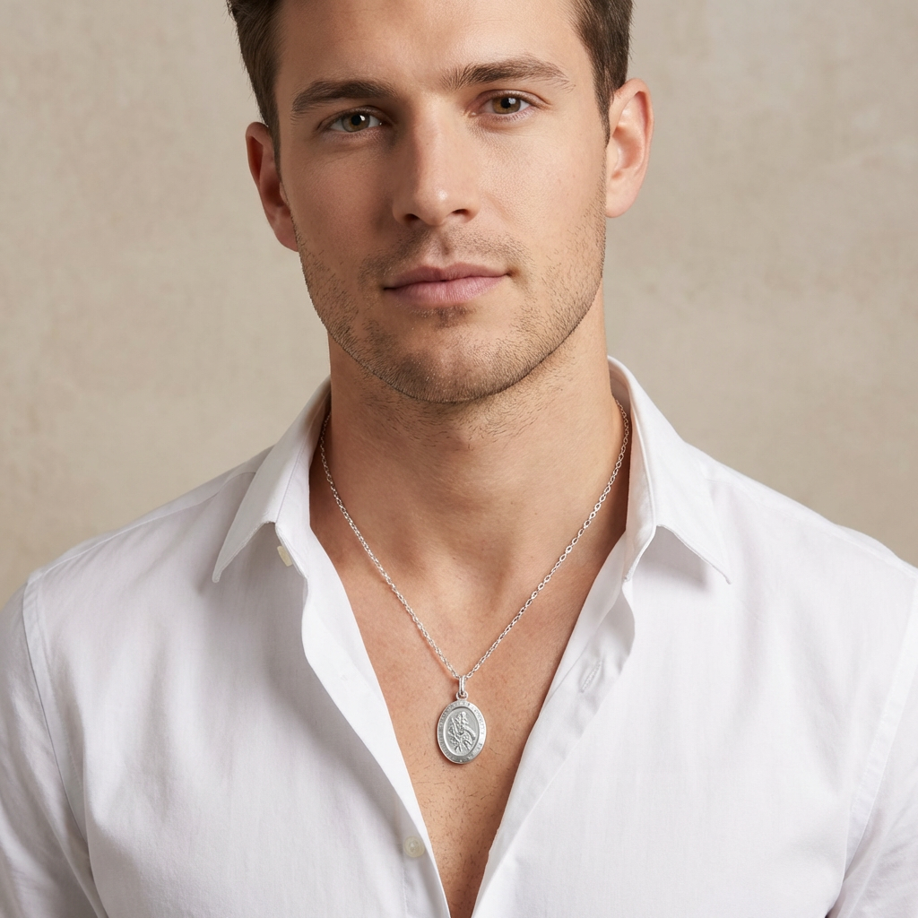 Crafted in solid 925 sterling silver, this oval St Christopher pendant necklace is a timeless symbol of protection and safe travels. Featuring the traditional St Christopher design on the front with the iconic “Saint Christopher Protect Us” inscription around the edge, it offers reassurance and meaning in a classic everyday style.
